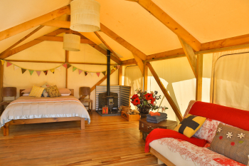 A country-themed Glamping site nestled into a sheltered spot with a luxury tent and hut, a camp kitchen and bathroom, and a dedicated campfire area, create a social and relaxed space from 2 to 10 people.